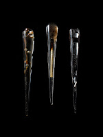 Danielle de Conge creates jewelry out of objects that we dispose-off on a daily basis and never once stop to consider their aesthetic beauty. In her hands bottle caps, toothpicks, glass from broken beer bottles, museum pins, and bandages are all reborn as adornments. I loved playing the guessing game with her, always surprised to discover which object she used to create a beautiful pair of earrings or an elegant necklace. De Conge’s pieces are striking and fresh. Who would have thought that a potato chip would make a great pendant? De Conge casts a half-eaten chip in bronze and hangs it off a copper chain- the outcome is an unrecognizable, yet beautiful and earthly, creation. How about a q-tip bent into the shape or a ring, then cast in bronze, with a chocolate pearl in the middle? I love the texture of each piece and how sculptural they look. All of her pieces have a presence. A bent cuff made of a disposed coffee cup channels armor worn by warriors but you do not need to sacrifice your femininity to wear her jewelry: a cleavage pendant made out of a burned match, with ash, encased in clear resin is another way to let your date know that “you are smokin’ hot!”